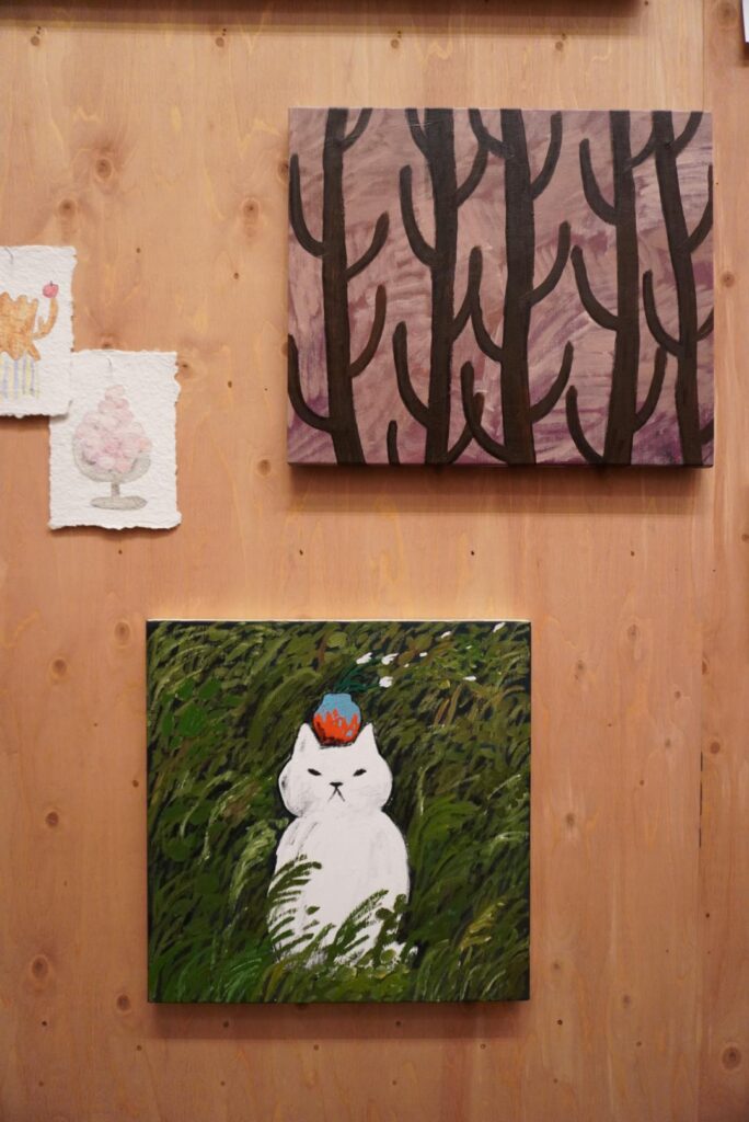 Recurring, faceless characters populate these dreamlike settings, a lavish table brimming with fruit, bread, books, cats, and flowers, or a towering bookshelf where trees grow beyond their frames, blurring the boundaries between the natural and the artificial. Presented as part of the Setouchi Triennale, ORIGIN captures Hirako’s poetic vision of coexistence and continues through November 9 in Okayama City.