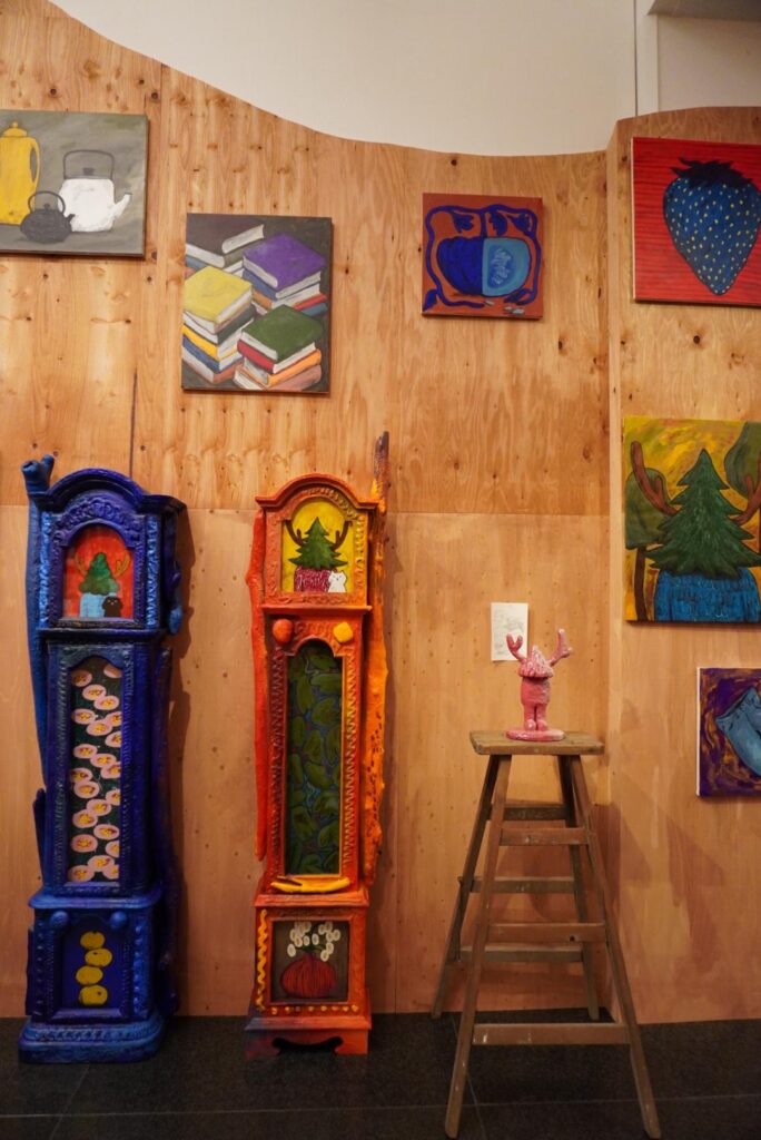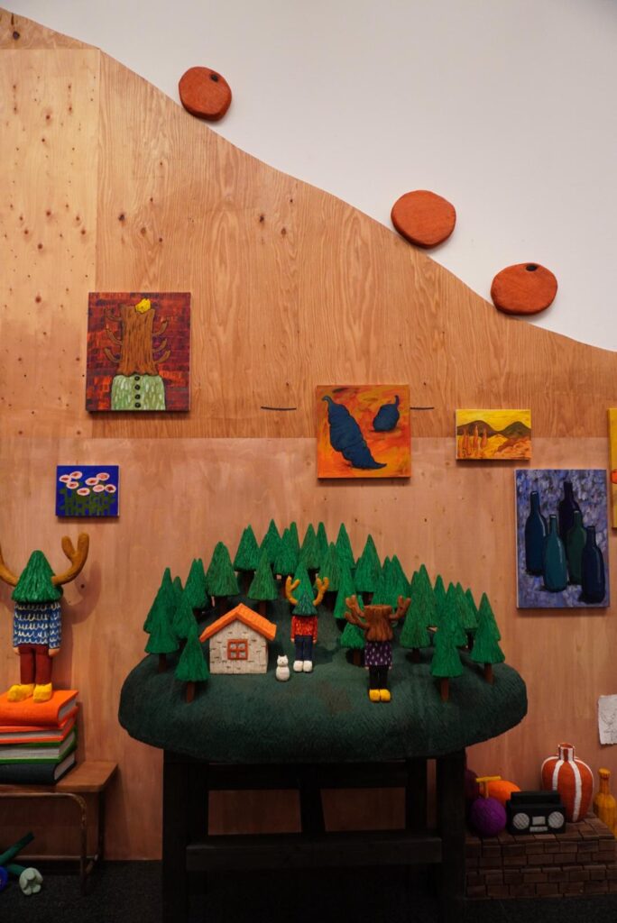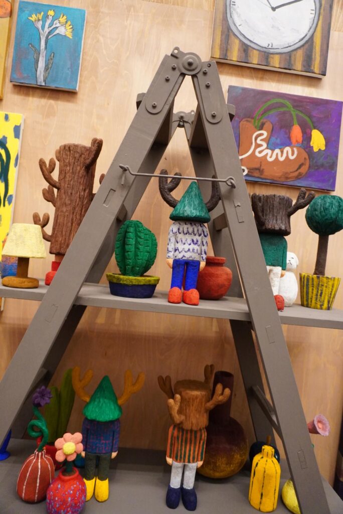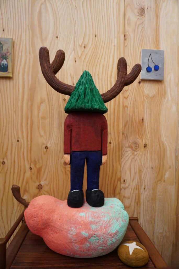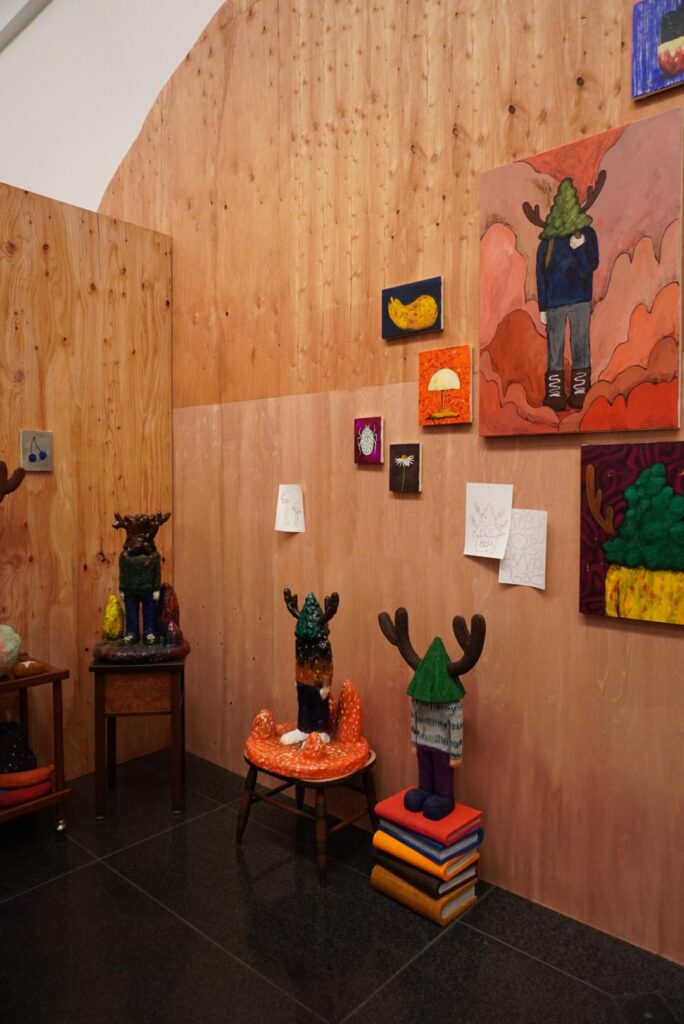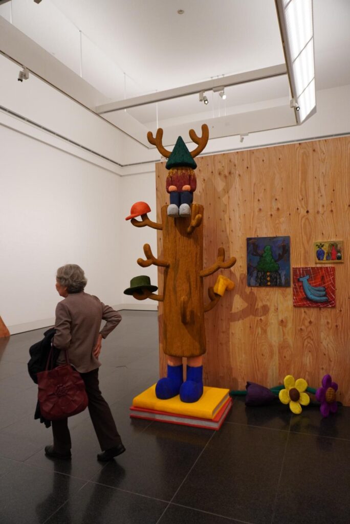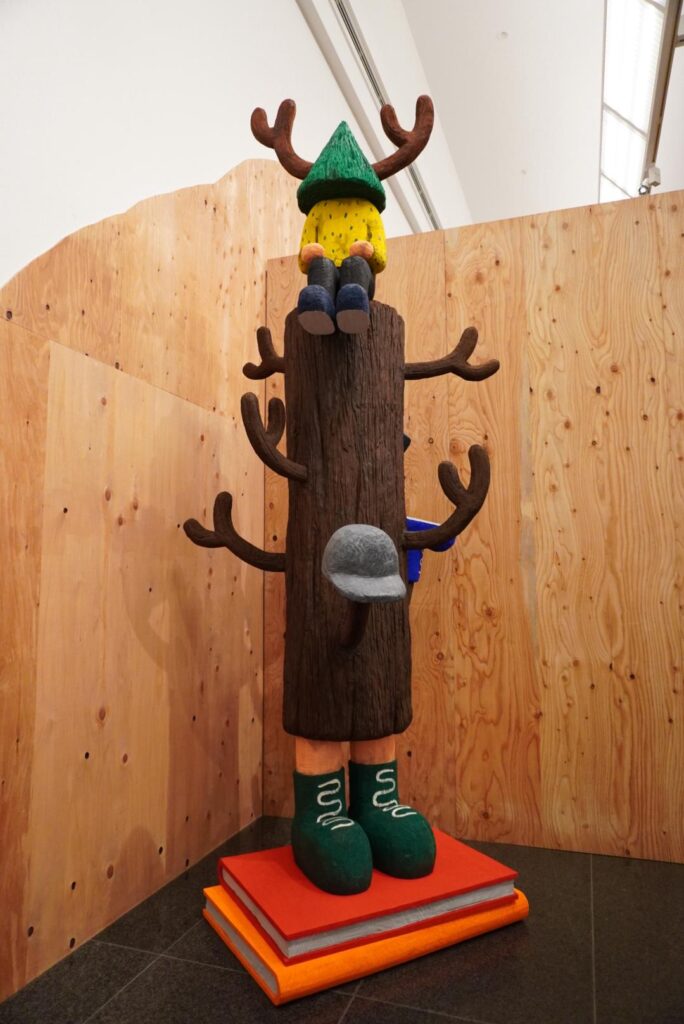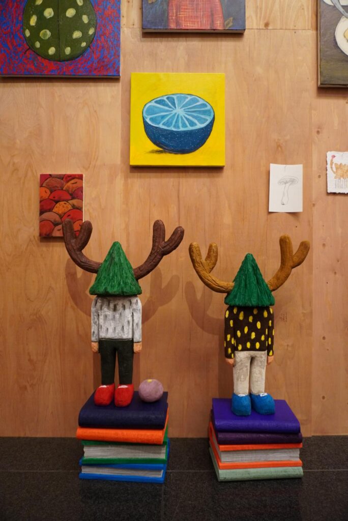 In Hirako’s uncanny world, the relationship between people, plants, and architecture unfolds in vibrant color and surreal proportion. His large-scale sculptures, paintings, and installations are often crowded with domestic objects, food, cats, and anonymous figures whose faces are obscured by cartoonish head coverings resembling trees or antlers. Visual metaphors for our merging with nature.
